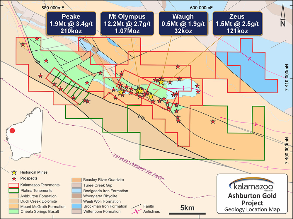 Covering 238km² on the southern edge of the Pilbara Craton, Kalamazoo acquired the AGP from Northern Star Resources (ASX: NST) in 2020. In 2023, Kalamazoo updated the Mineral Resource Estimate to 16.2Mt @ 2.8g/t Au for 1.44Moz (JORC Code 2012). This increase represented a 10% increase in grade across the resource base and 68% increase in the Indicated Category ounces.The MRE includes mineralised materials across four deposits at the AGP with the Mt Olympus Deposit accounting for 75% of total resource base ounces.