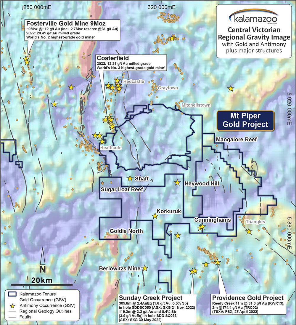 The Mt Piper Gold Project is adjacent to Agnico Eagle Mine Limited’s (NYSE: AEM) large exploration land tenure and 30km from its world-class 9Moz Fosterville gold mine, with Costerfield Gold-Antimony Mine to the north and the Sunday Creek Gold-antimony discovery to the south. In 2022, Fosterville (20.4g/t Au) and Costerfield (12.2g/t Au) were the world’s 2nd and 3rd highest-grade gold mines (S&P Market Intelligence 13 December 2022).