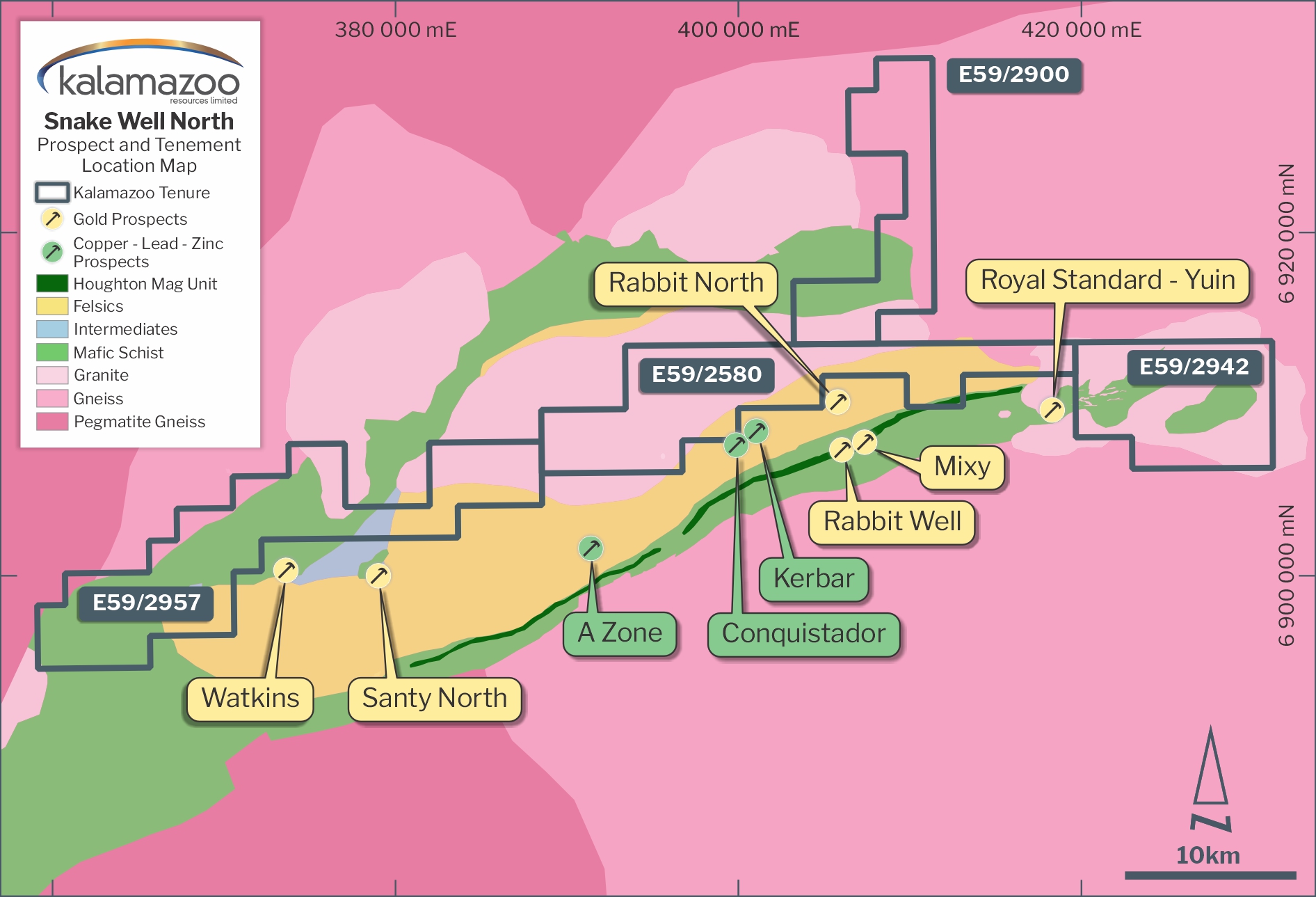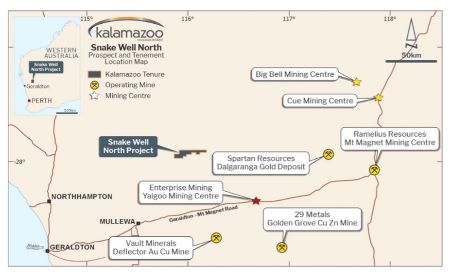 Located in the Murchison Region 160km east of Mount Magnet of Western Australia Kalamazoo has been exploring at Snake Well Base Metals Project since the first tenement (E59/2900) was granted in 2022. In addition to this tenement Kalamazoo has made two more exploration licence applications which are both awaiting grant (E59/2900 and E59/2942). The project is ideally located directly to the north of the Snake Well Gold Project, which formed a key role in Kalamazoo’s IPO and listing on the ASX in 2017. This project was subsequently sold to Adaman Resources for $7 million in 2019. Early Archaean greenstone belts in the Murchison including the Archaean Tallering Greenstone Belt, and Yalgoo Greenstone Belt that hosts the Golden Grove and Scuddles deposits, are widely recognised as prospective terrains for volcanic hosted massive sulphide (“VHMS”) type mineralisation.